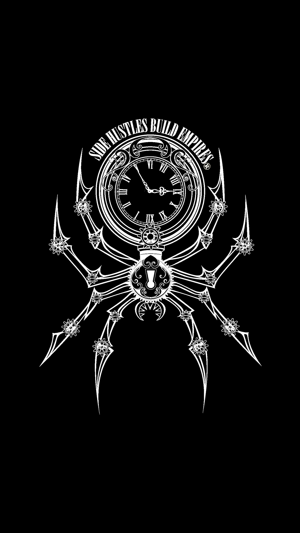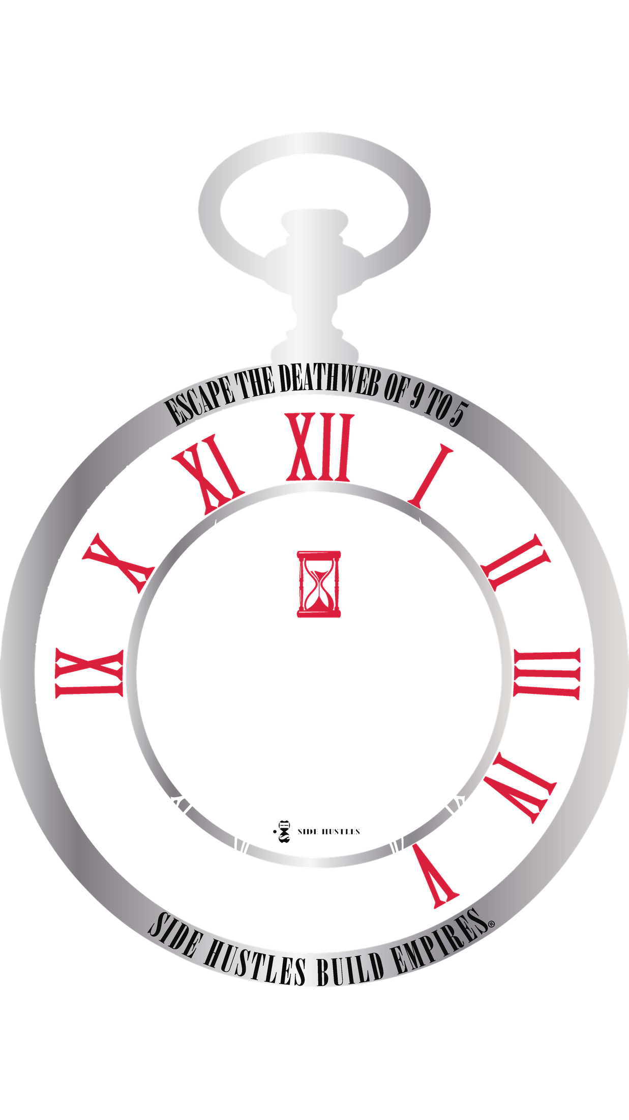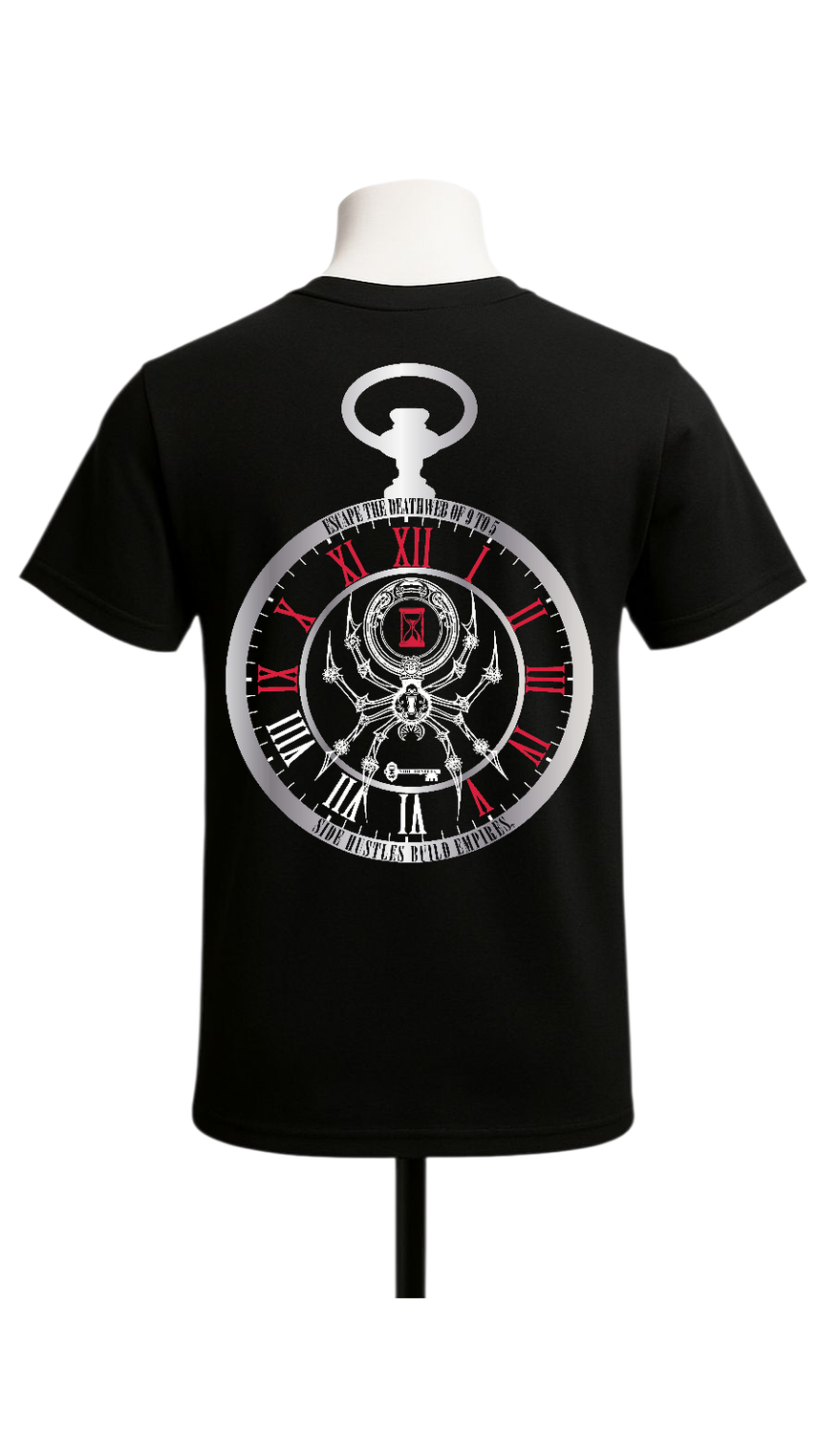 The No 9 to 5 design is a bold take on modern work culture. Featuring a pocket watch, mechanical spider, and key marked “Side Hustles,” it symbolizes breaking free from corporate control to build your own empire. A striking reminder that freedom belongs to those who hustle.
